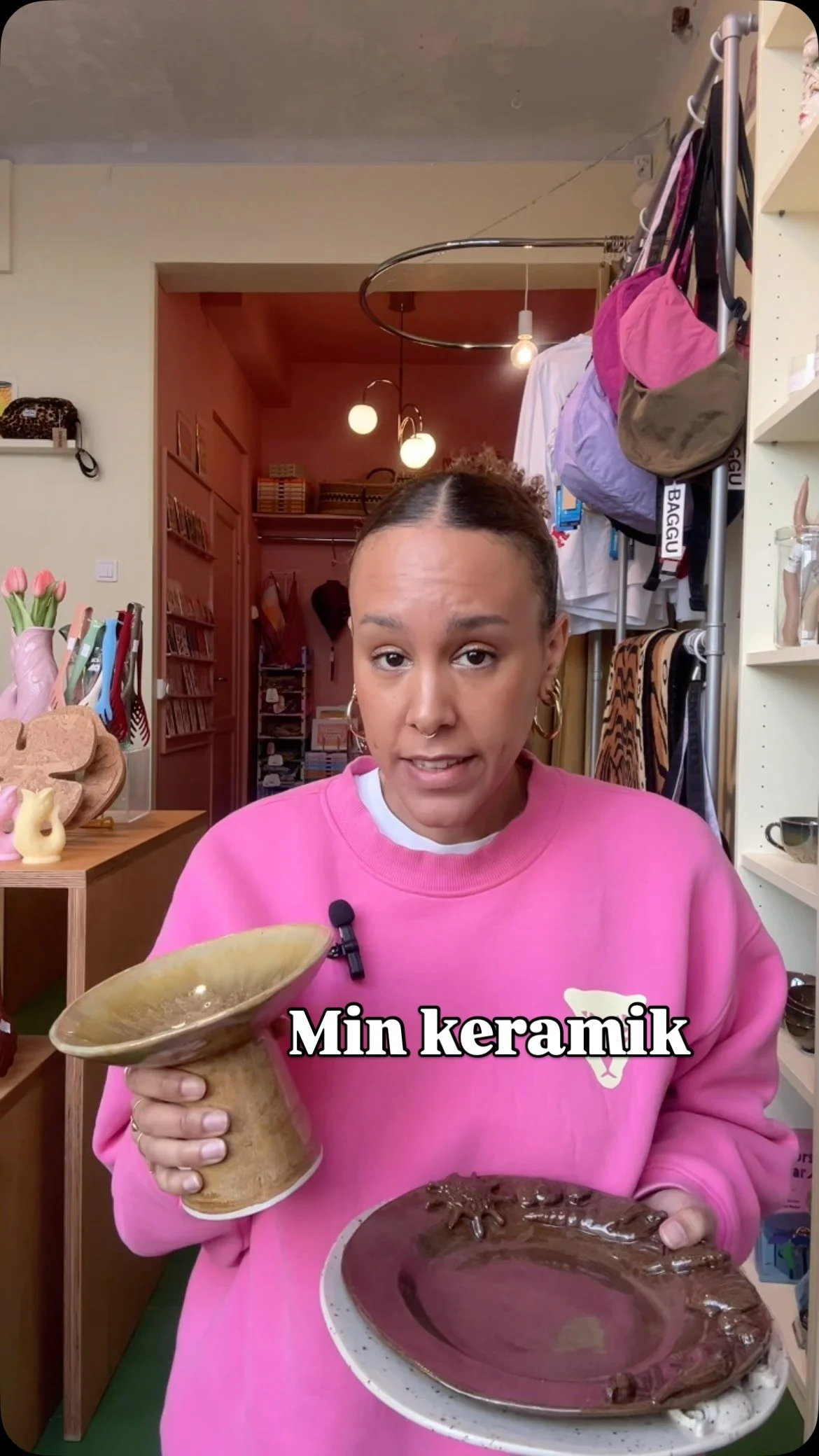 En person i en butik med hatt tittar på färgglada väskor och andra accessoarer, med varor på hyllor i bakgrunden.
